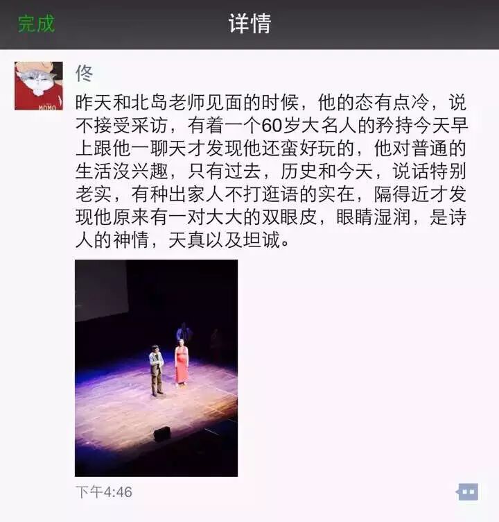 我的朋友圈,仅有一位朋友刷出了“北岛”,她是风眠艺术馆馆长姚远东方女士,她的专栏作家朋友黄佟佟正是被特邀到挪威报道的资深记者之一。