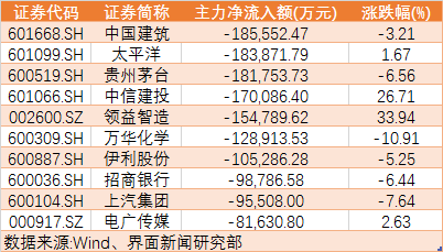 在本周主力资金持续净流出个股中,共计117只个股累计主力资金净流出额超过1亿元,较上周增加6只。这其中,中国建筑(601668.SH)、太平洋(601099.SH)、贵州茅台(600519.SH)等个股本周遭主力抛售幅度最大,其累计净流出额分别为18.56亿元、18.39亿元、18.18亿元。