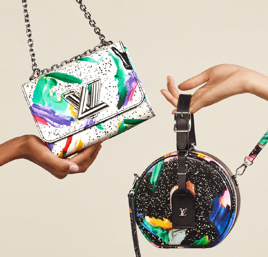 最为瞩目的设计来自全新的 Toupie Monogram 包袋,咖啡色帆布和 Logo 印花为整体烙上了品牌的经典印记,迷你陀螺造型既呼应了当前的小包袋风潮,也显现出丰富趣味;Petite Boîte Chapeau 帽盒形手袋让人联想到奇异世界中的灿烂繁星,如同热带鸟类羽毛般的绚丽泼彩印花和闪亮星光交相辉映,带来视觉上的极大满足;Twist 中号手袋的泼彩印花则带有抽象派艺术家的随性,白色皮革上点缀着水墨画般的墨点,显现出巧妙对比。