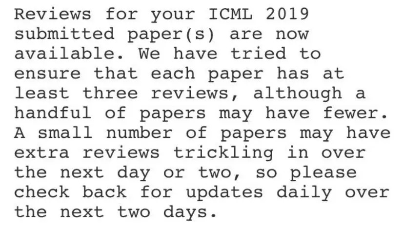 现在,您可以查看ICML 2019提交的论文评审结果了。我们已经尽力保证每篇论文至少有3条评审结果,但是有一部分论文的评审结果可能少于3条。有一小部分论文可能会在未来一两天内陆续收到额外的评审,请在接下来的两天内查看更新情况。
