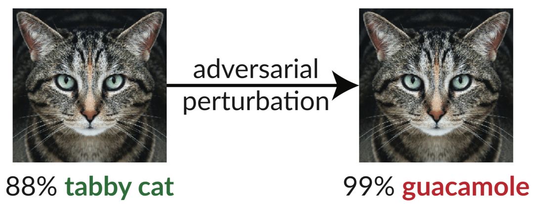 基于神经网络的分类器通常被用于图像分类,它们的水平通常接近人类。但是,这些相似的神经网络特别容易受到对抗样本和细微的干扰输入的影响。下图是一个典型的对抗样本,对原图增加一些肉眼看不见的扰动后,InceptionV3分类器把猫分类成了鳄梨酱。根据Szegedy等人2013年的研究显示,这种“愚蠢的图像”仅用梯度下降法就能合成,这类发现为物体检测研究敲响了警钟。