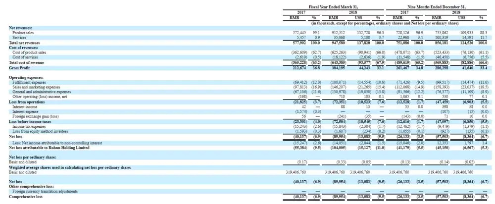2018财年,总营收成本6.43亿元,毛利3.04亿元,销售与营销费用1.46亿元,总务及管理费用1.3亿元,总运营亏损7235万元。该年净亏损8995万元,归于如涵控股有限公司的净亏损约为1.04亿元。