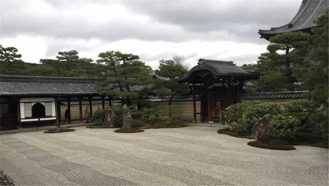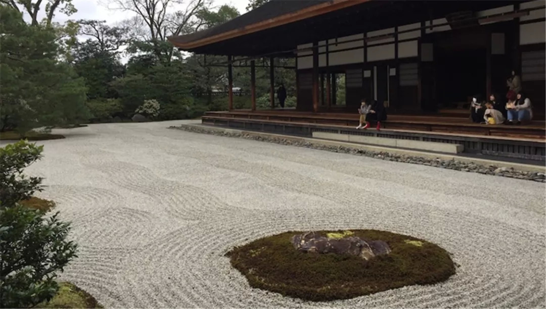 前庭枯山水堪称极致,洁净的白砂铺地,并做简素的川流状,筑山、池泉、雅松翠柏等点缀其间,其中配以大小不一的15块石头分别放置在5处,加上苔藓的点缀,抽象化为海、岛、林,幻化出另一种境界,看似简单之极,但是不管从庭园的哪个角度看去,15块石头中总有一块石头是被挡住的,在这长度为25米,宽仅10米的园子里把日本人追求虚饰意境之美淋漓尽致地体现出来。