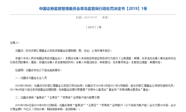 近日,证监会青岛监管局发布公告,对农银汇理基金公司投资部基金经理助理刘嘉庆违规进行证券投资的行为作出行政处罚。