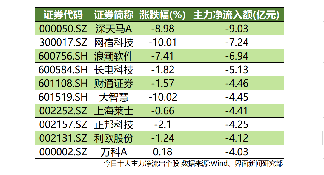 沪深两市共计75只个股主力净流出额超1亿元。柔性屏板块逐级降温,深天马A(002341.SZ)盘中跌停、遭9.03亿元主力资金净流出,净流出额位居两市之首。软件股全线回落,浪潮软件(600756.SH)、大智慧(601519.SH)上榜,分别遭到6.94亿元、4.45亿元主力资金净流出。