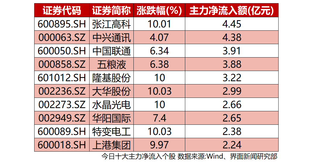 剔除尚未开板的新股,全天沪深两市主力净流入额超过1亿元的个股数量为48只。张江高科(600895.SH)、中兴通讯(000063.SZ)分别吸引主力资金4.45亿元、4.38亿元,净流入额居前。