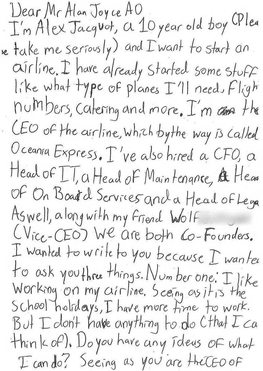 据澳洲网报道,近日,澳大利亚一名10岁男孩给澳航首席执行官阿伦•霍伊塞写信,称和同学创办了自己的航空公司,希望霍伊塞能就如何更好的经营提出建议。据报道,10岁的“商界新秀”嘉可和学校的朋友们一起创办了自己的航空公司Oceania Express。在放假期间,他在一封写给霍伊塞的信中写道,“你好,我是嘉可,今年10岁(我是认真的),我想开一家航空公司。”嘉可讲述了他拟定的计划,如需要什么飞机、航班号以及餐饮服务等。然后,他向霍伊塞征询建议,“你对运营航空公司有什么建议吗?我很想知道你的想法。”
