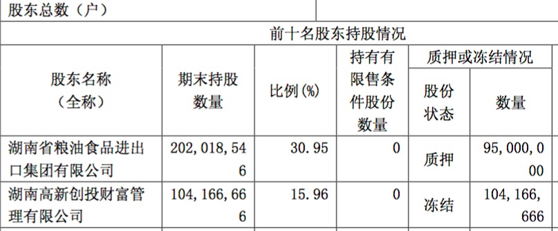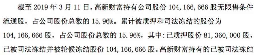 据减持公告,截至2019年3月11日,高新财富持有公司股份1.04亿股无限售条件流通股,占公司股份总数的15.96%。累计被质押和司法冻结的股份为1.04亿股,其中:已质押股份8136万股,已被司法冻结并被轮候冻结股份1.04亿股。高新财富持有的已被司法冻结并被轮候冻结的1.04亿股中,原已被质押的1545.3万股已被两次轮候冻结,原已被质押的6591万股已被一次轮候冻结,原未被质押的2281万股已被一次轮候冻结。