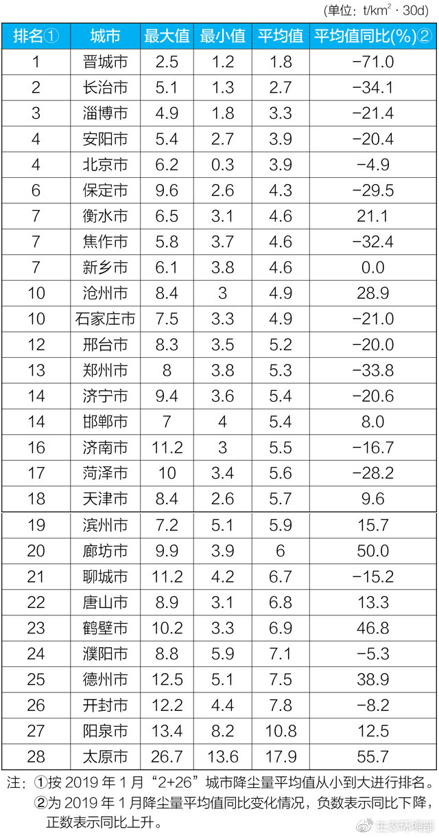 据生态环境部消息,3月12日,生态环境部向媒体通报了2019年1月京津冀大气污染传输通道“2+26”城市降尘监测结果。