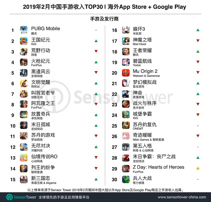 其他游戏方面,FunPlus旗下的《Z Day: Hearts of Heroes》自去年6月在全球市场发行以来,首次跻身榜单28名,也是2月份收入榜上唯一的新面孔。这款游戏是以二次世界大战为背景的MMO手游,主要收入来源于美国、韩国和德国,分别占比35%、13%和8%。加上《Z Day: Hearts of Heroes》,FunPlus旗下共有三款产品进入了出海收入榜,其他两款游戏是《火枪纪元》和《阿瓦隆之王》,分别位列第4名和第8名。