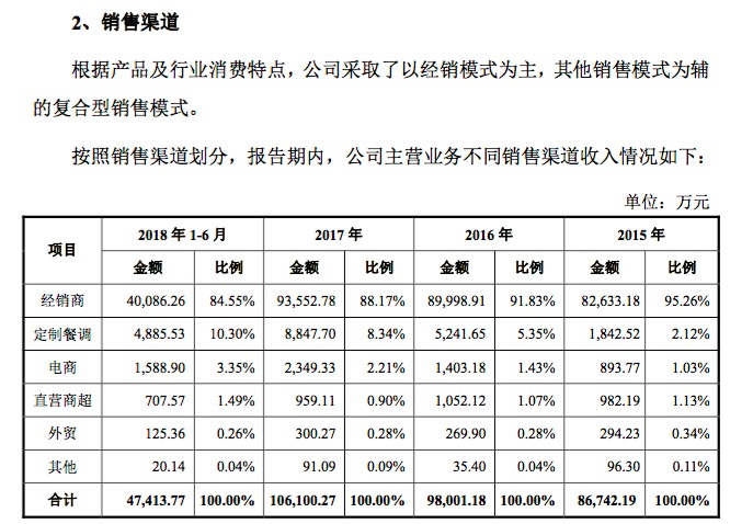 天味食品销售渠道以经销商为主,2018年1-6月公司合作的经销商有751家,销售网络覆盖约30.8万个零售终端、5.86万个商超卖场和4.1万家餐饮连锁单店。报告期内,经销商渠道销售收入占主营业务收入比重分别为95.26%、91.83%、88.17%和84.55%,电商、直营商超等其他的销售渠道占比较小,若经销商体系出现问题,那么公司产品销售或将产生一定影响。