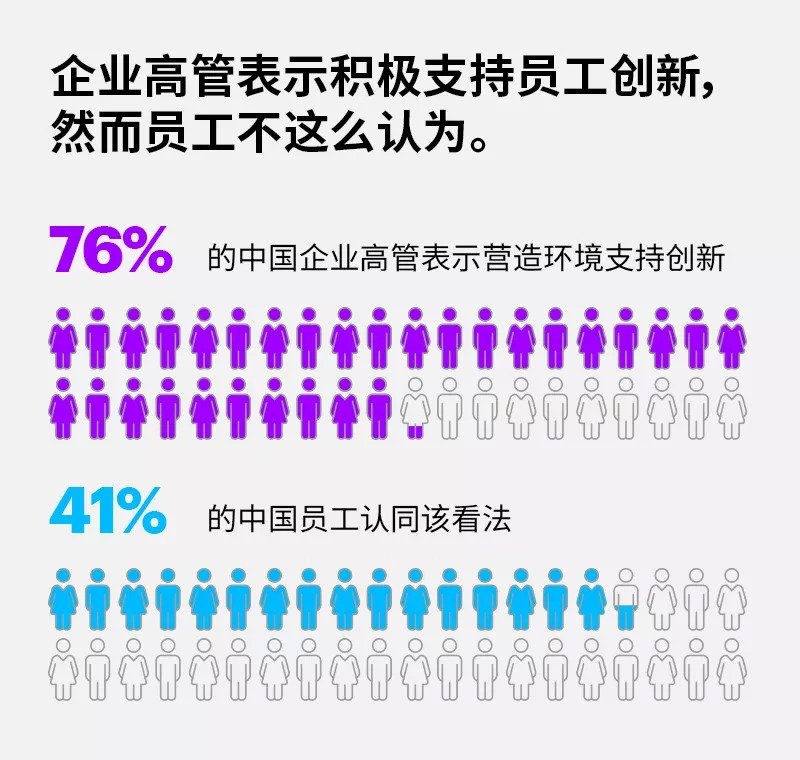 此外,企业最高管理层与普通员工之间的认识差距也亟待弥合。在中国,有76%的高管表示他们正在营造环境,支持员工创新,然而只有41%的受访员工认同此看法。在激发员工创新动力方面,高管似乎高估了物质奖励的重要性,而忽视了目标所起的引领作用。对于中国员工来说,在更为平等的企业文化中,最能有效支持创新的因素包括:提供相关技能培训、灵活的工作安排和远程办公。