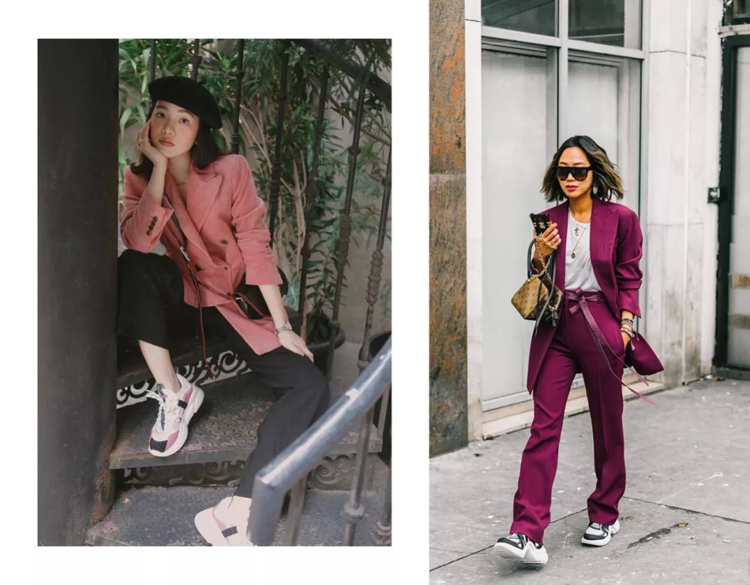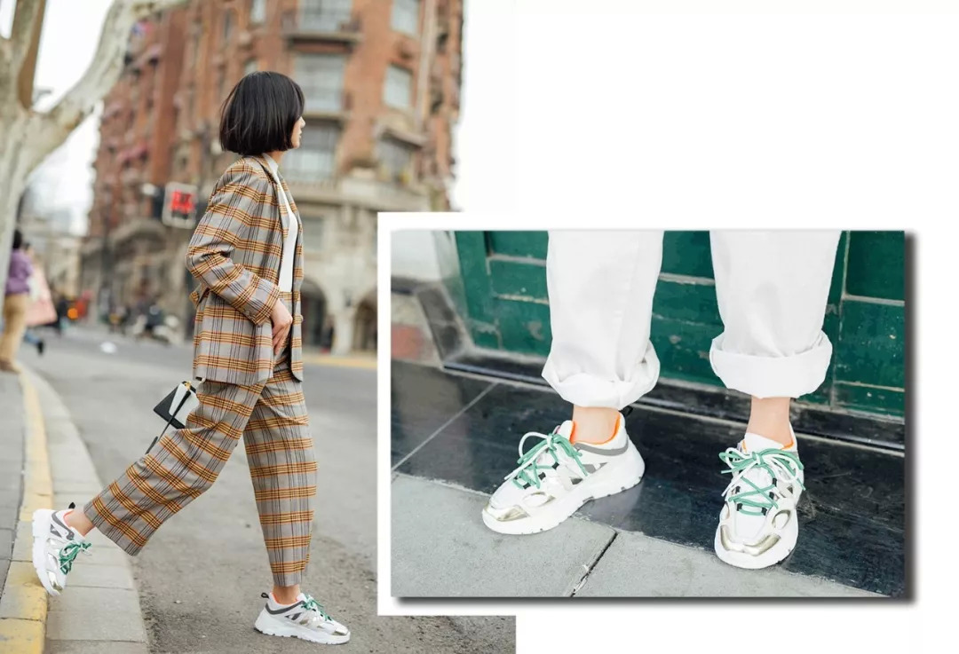 老爹鞋还可以搭配风衣、西装这一类通勤单品,恰好化解了沉闷职场的一本正经。
