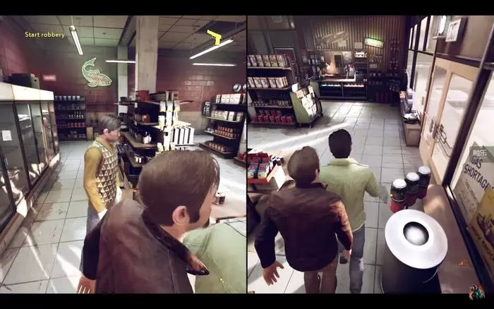 例如在一个场景中,他们上电梯时和警卫同行,警卫似乎认出了两位逃犯,系统会询问你该用谁的办法解除这场危机。如果用Leo的办法,Leo会从警卫身后冲过去给他一拳,然后把他放在电梯里不管不顾;如果用Vincent的办法,Vincent会假装自己是病人,边说话边咳嗽,警卫害怕被传染,会加快脚步走出电梯。