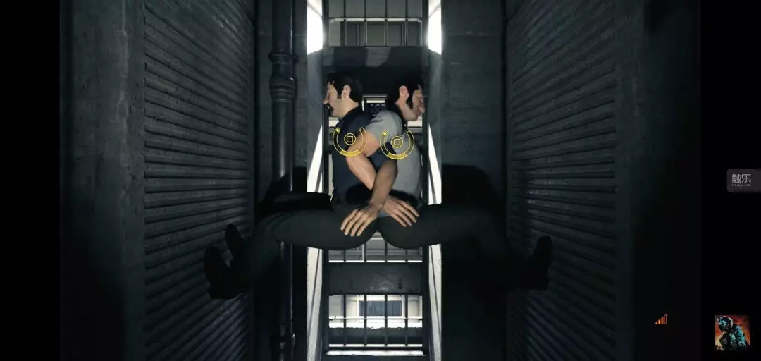 这样的镜头在这段剧情中比比皆是,Josef Fares利用楼梯、楼层间隔、显示器和监控摄像头等空间位置的转移多次完成了玩家之间操作的轮替。
