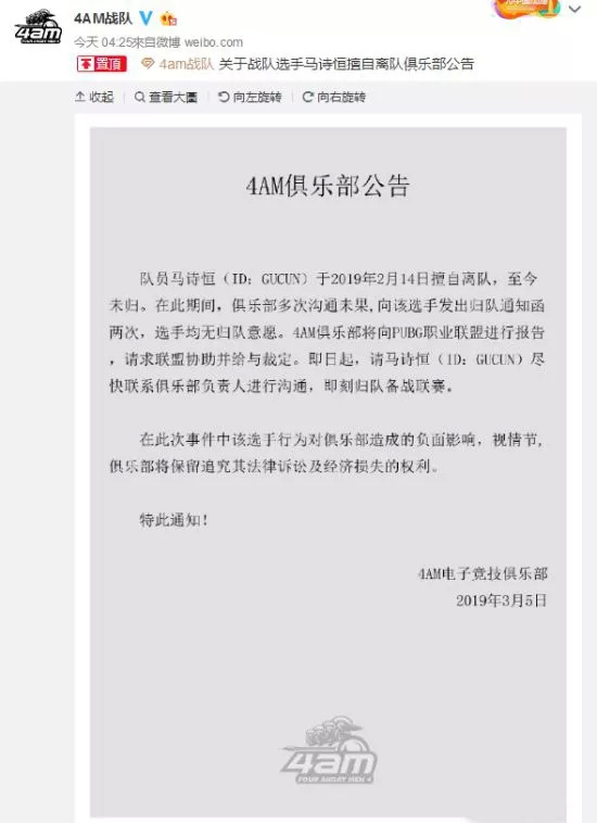2019年2月15日,《绝地求生》最有人气的战队4AM人气选手孤存从俱乐部出走,错过之后的黄金大奖赛,并且闹出年后电竞圈的第一大“吃瓜”事件——在4AM其他队友鏖战黄金大奖赛争取去伦敦的国际邀请赛期间,孤存部分粉丝的言论攻击之下,4AM俱乐部管理层公布孤存擅自离队的消息,接着孤存也在直播中晒出被“代签”的合同,由此,正式撕破脸面,成为开年后电竞圈的焦点事件。
