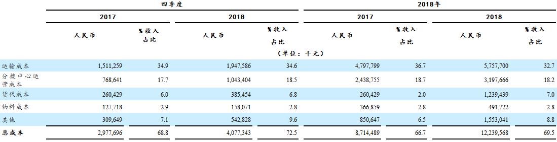 从营业成本方面看,2018年中通全年营业成本122.40亿元,同比增长40.5%;其中,全年运输成本57.58亿元,同比增长20.0%。
