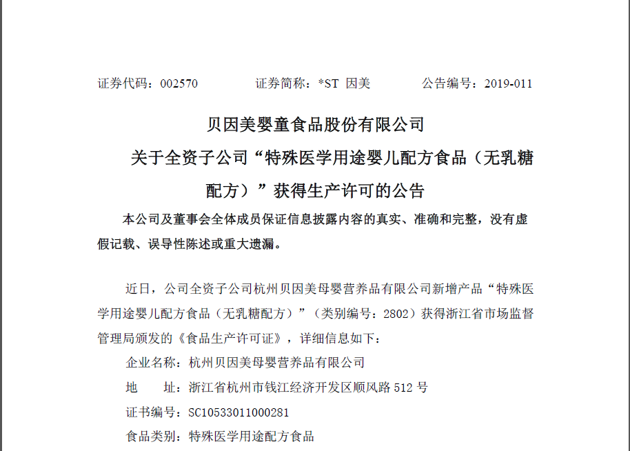 3月12日晚间,*ST因美(002570.SZ),业界俗称“贝因美”,发布了《关于全资子公司“特殊医学用途婴儿配方食品(无乳糖配方)”获得生产许可的公告》。