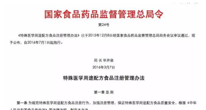 2016年3月,原国家食药监总局披露《特殊医学用途配方食品注册管理办法》全文,称该管理办法已于2015年12月8日经国家食品药品监督管理总局局务会议审议通过,并会在自2016年7月1日起施行。