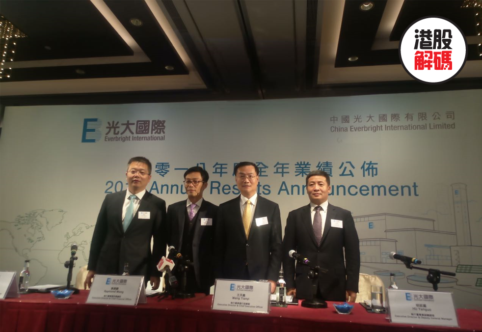 3月12日下午,光大国际在港举行2018年全年业绩发布会,执行董事兼行政总裁王天义携执行董事兼副总经理钱晓东、执行董事兼财务总监黄锦骢及执行董事兼副总经理胡延国出席并答记者问。
