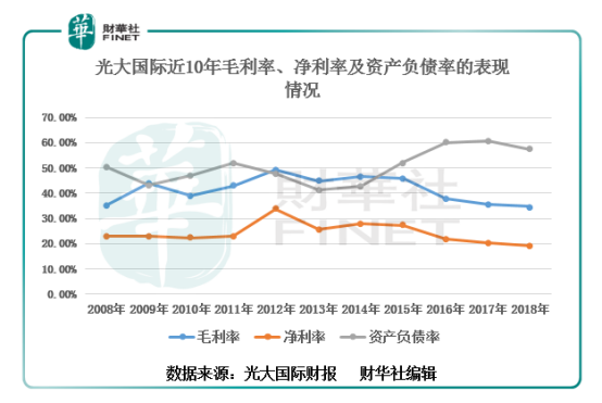 截至2018年底(如图所示),光大国际的毛利率为34.64%,净利率为19.35%。其中毛利率及净利率均从2012年的高点下滑至今。(“三费”大增及毛利率下滑原因在下文解答环节)
