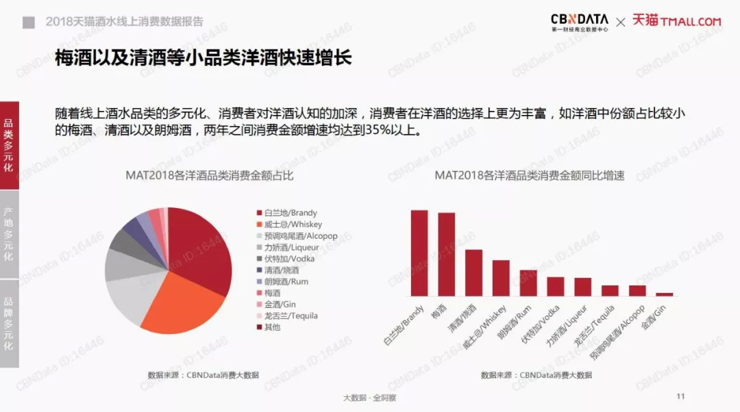 更重要的是,区别于老一辈消费者的保守专一,好奇心更重的小酒鬼们更愿意去尝试不同花样的洋玩意儿。“平时会在电商买洋酒和葡萄酒,我最爱喝的是清酒,入口好,还有一点点后劲儿,温热也可以喝。”的确,随着线上酒水品类的多元化、消费者对洋酒认知的加深,消费者在洋酒的选择上更为丰富,包括静子喜欢的清酒在内,洋酒中份额占比较小的梅酒以及朗姆酒,两年之间消费金额增速均达到35%以上。霸占中国酒饮市场多年的国产白酒可能很是郁闷,下一代消费者竟然都转投了外国白酒的怀抱。