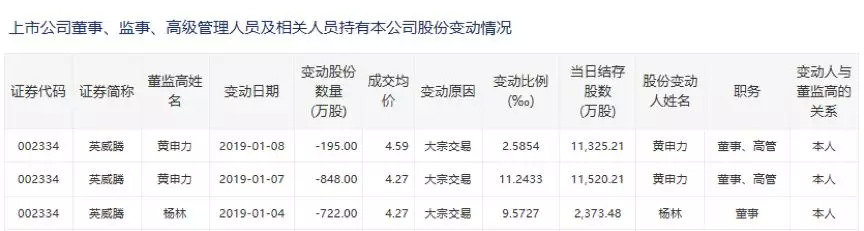 另外,公司董事杨林于2019年1月4日通过大宗交易减持722万股,减持参考市值约3,082.94万元。