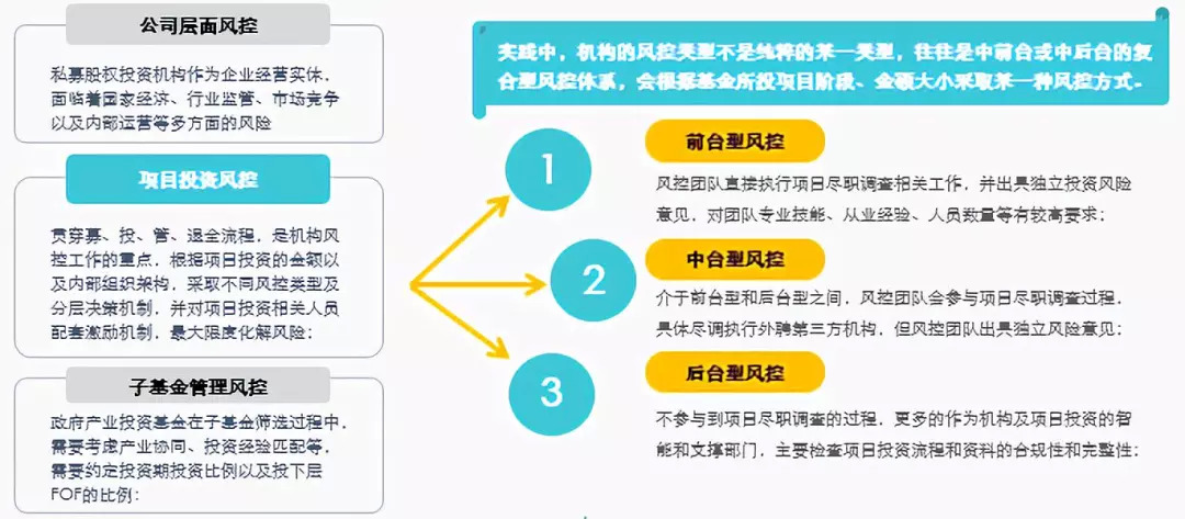 综合来看,在实践中,大多数机构都设有多支基金,这些基金投资的项目领域和方向不同,而且有的机构还会有一定比例的间接投资,因此,很少有一家私募股权投资机构的风控体系类型是纯粹的前台型风控或中台型风控或后台型风控,而往往是上述中前台或中后台交织在一起形成的复合型风控体系。