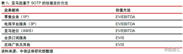 亚马逊:EV/S、EV/EBITDA。公司旗下业务包括电商(1P、3P)、订阅服务、在线广告、云计算等板块。估值层面,市场一般基于SOTP,并根据各业务属性特征,选择相应估值方法定价加总。例如,源于重资产属性,电商业务、云业务一般采用EV/EBITDA估值方法,而会员订阅、广告等轻资产业务则采用EV/S估值方法。