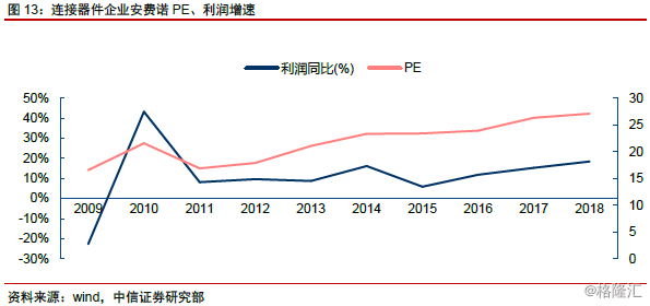 安费诺:PE。作为全球最大的连接器件公司之一,公司估值方式&逻辑和苹果、台积电等成熟企业较为一致,PE为主要估值方式,估值水平则主要受市场流动性环境、企业自身盈利增速预期等因素影响。