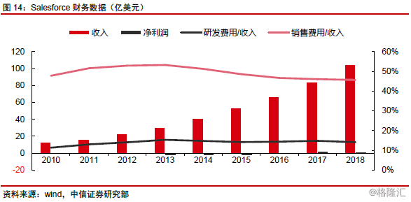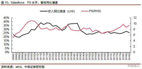 Salesforce:P/S。作为SaaS企业典型代表,该类企业模式和互联网公司较为类似,前期以获取用户作为战略优先项,体现为销售费用、研发费用占比较高,待客户群积累&沉淀完成后,营销&研发费用占比快速降低,利润亦快速释放。市场一般采用P/S、EV/S、P/OCF等估值方式,淡化对短期利润数据的关注,更注重关注收入、收入增速等核心指标。