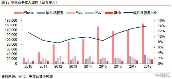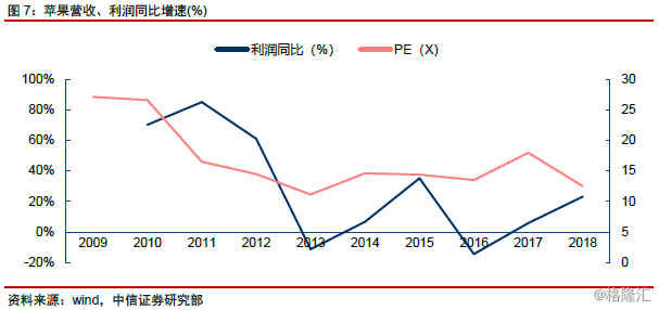 苹果:PE。作为全球利润最为丰厚的手机终端厂商,随着全球智能手机市场销量逐步趋于稳定,公司估值水平亦进入相对稳定区间,业绩表现亦主要受iPhone销量的驱动,PE成为该类企业主要估值方法。而近年来,随着服务类收入占比的提升,带来业绩稳定性、Margin的显著改善,亦成为苹果PE水平上行的主要支撑因素之一。