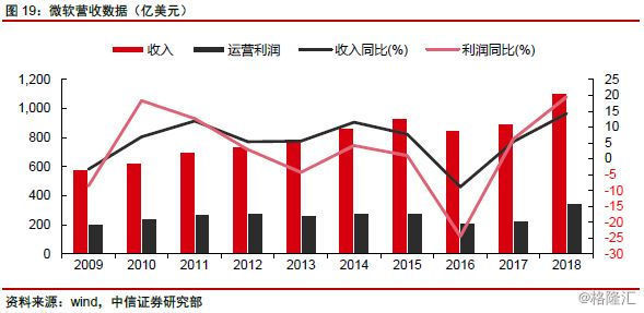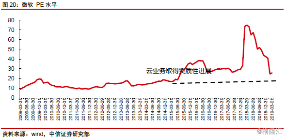 2015H2~现在:2015Q2(自然年)公司商业云年化收入达到80亿美元,Azure、office 365业务等表现获得实质性进展。估值层面,虽然短期公司收入、运营利润表现依然承压,但是市场开始对云计算业务给予明显估值溢价。同时考虑到微软自身业务的复杂性,和难以获得各分项财务指标,市场便通过简单抬升PE水平的方式计入云计算业务价值。
