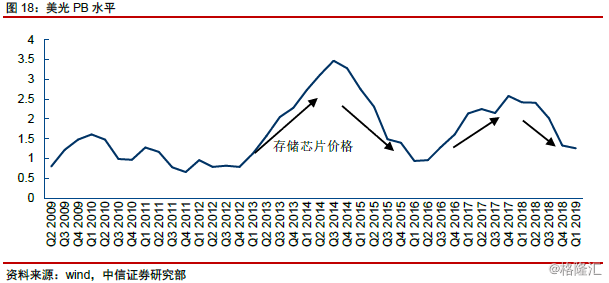 美光:PB。作为全球最大存储芯片厂商之一,公司业绩受全球存储芯片供需周期影响极为明显。市场一般采用PB方式对公司进行估值定价,而PB水平则主要受到存储芯片产业周期的影响,体现为周期景气上行期,高PB,反之亦然。以最近一轮的存储芯片周期为例,2016Q3开始,全球存储芯片价格持续上行,并于2017Q4~2018Q1开始见顶回落,公司PB水平亦相应跟随调整。