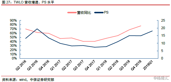 Twilio:作为云通信领域的初创企业,自公司2016年上市开始,市场便采用SaaS公司的估值方法对其进行估值定价。公司业务的高波动性,亦导致资本市场不断调整对其业务稳定性、成长性的预期,并反映为频繁、大幅的PS估值水平调整。而对于去年在港股上市的美团来说,自上市至今,伴随市场对其业务及进展的认知变化,其股价表现亦出现大幅的波动。