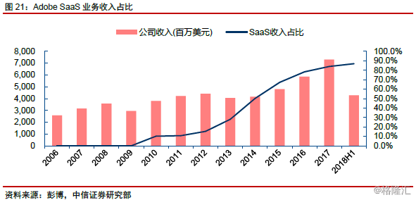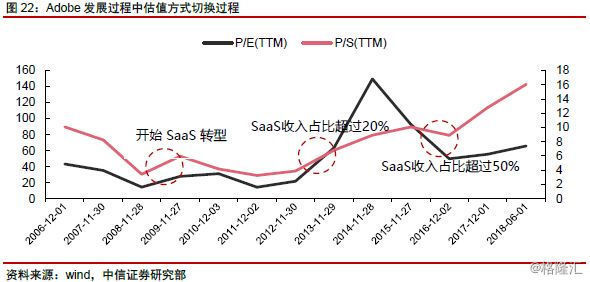 Adobe:作为传统的工具软件厂商,自2009年开始,公司全面启动向SaaS转型,并经历了从传统软件企业转型SaaS企业的完整历程。市场亦根据公司SaaS业务转型进度、阶段,相应调整对公司业务的估值方法&水平: