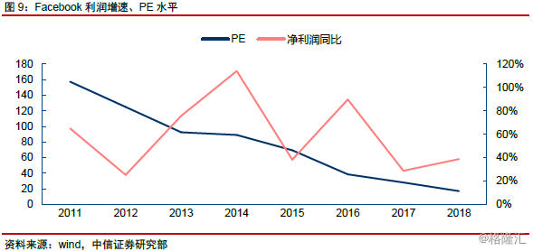 Facebook、腾讯:从PEG到PE。分别作为全球最大、国内最大的社交网络平台,从上市至今,两家公司均经历了业务快速增长、稳步发展两个主要阶段。高速增长期,市场主要采用PEG进行估值,并结合平台用户规模、用户ARPU等不断修正对盈利增速预期;进入稳定增长阶段,PE成为合理估值方式,估值水平亦主要受企业自身业绩增速水平等因素影响。