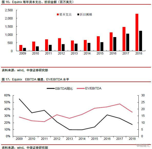 Equinix:EV/EBITDA。作为全球最大的零售型IDC厂商,企业在快速发展中,需要大量的资本性投入,以实现资源扩充、业务的增长,而大量的资本支出亦会通过折旧、利息费用增加等方式大幅侵蚀企业当期的利润。为了还原资产折旧对利润项的影响,市场引入EV/EBITDA等估值方式,以反映公司的真实价值,同时EV/EBITDA水平亦主要受成长性等因素驱动,内在逻辑和轻资产类企业的PE逻辑较为一致。