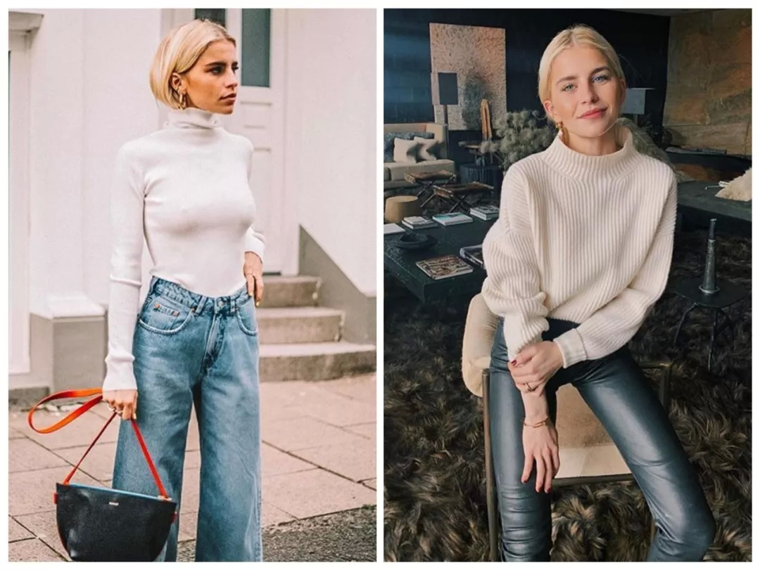 白色打底主要有两款:春秋季穿的修身款,以及冬季穿的宽松版。划重点:都是小高领。