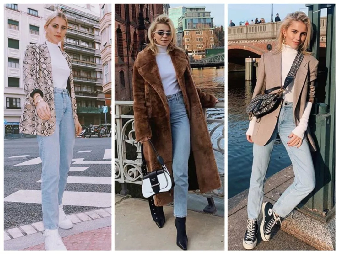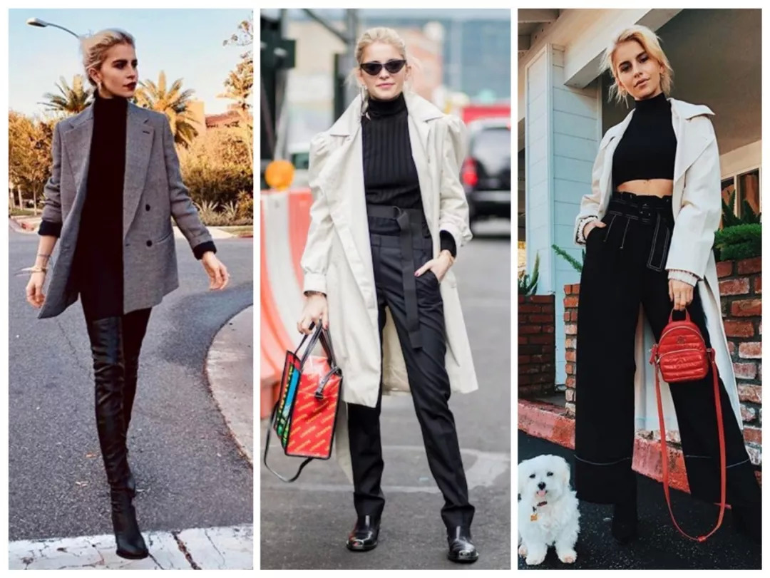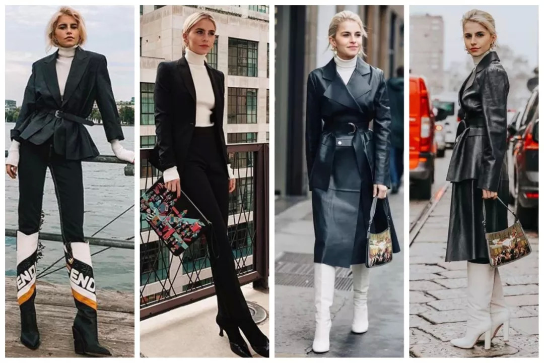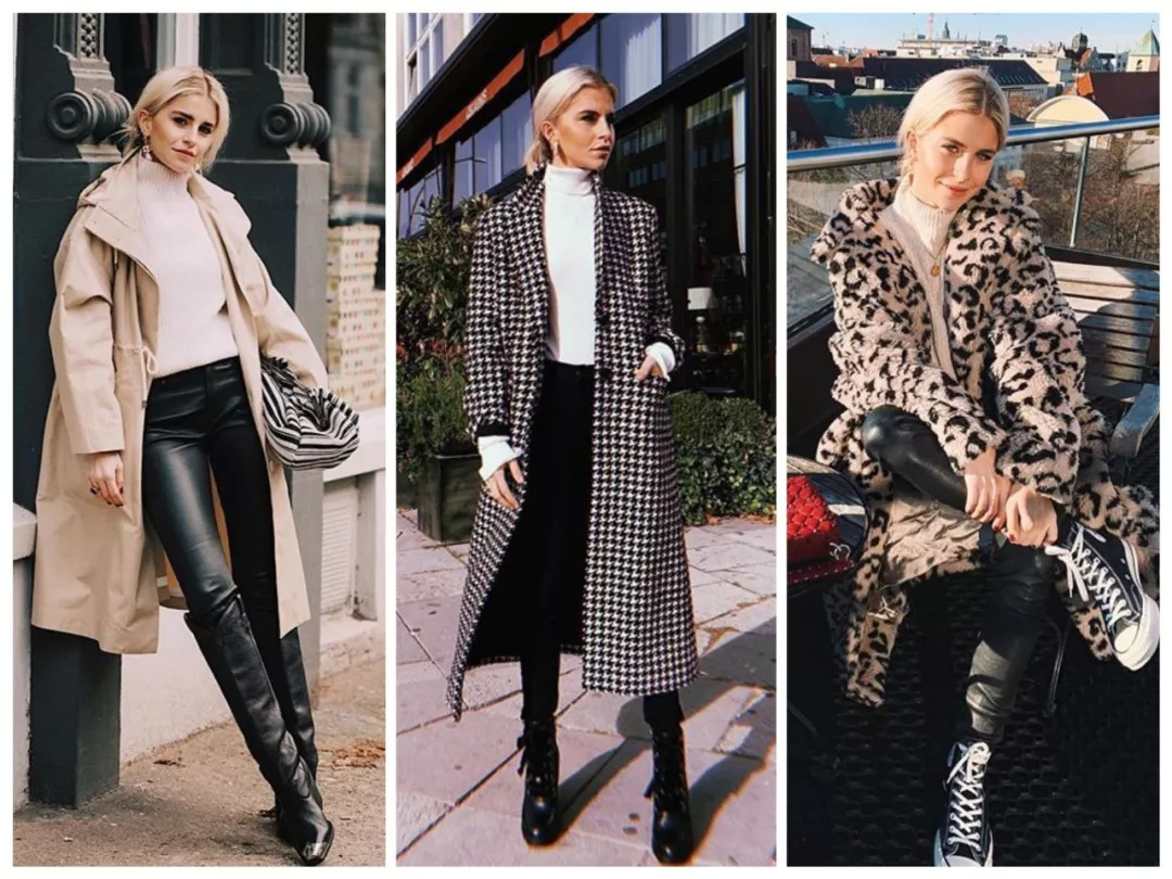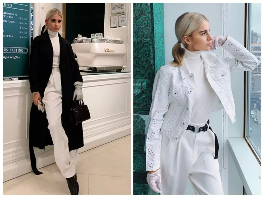 Caroline Daur最爱用白色内搭+黑色裤装。上白下黑的经典组合,显高显瘦。外套选风衣、豹纹、格纹,花一点都没关系。