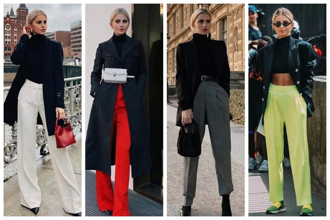 此外,Miss 烧饼还发现Caroline Daur的一个小秘诀:黑色内搭+黑色外套+彩色阔腿裤,不光隐藏身材缺陷,还超吸睛!超时髦!