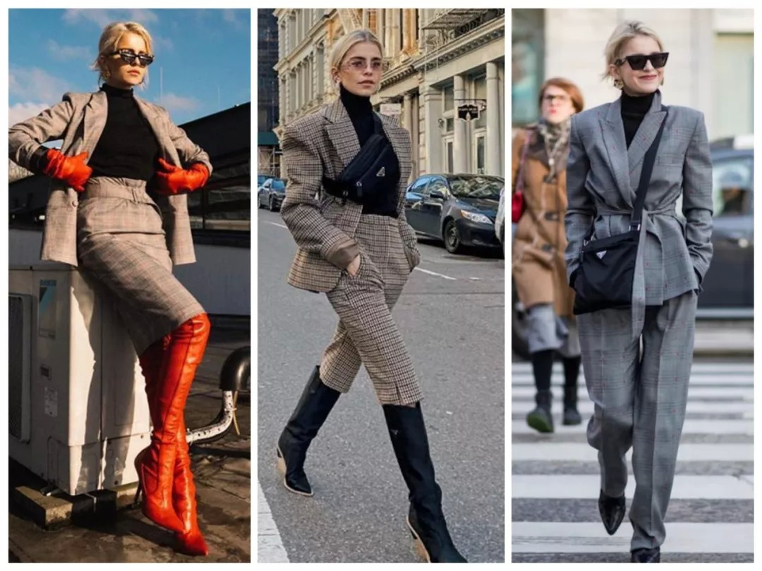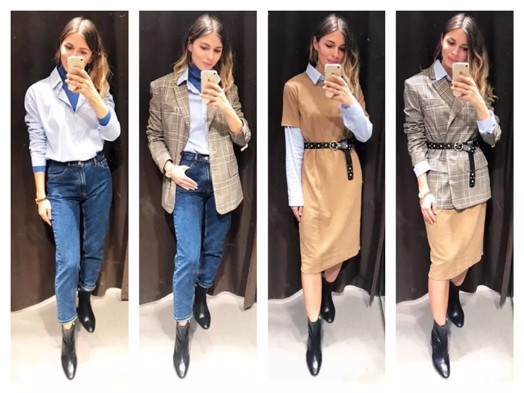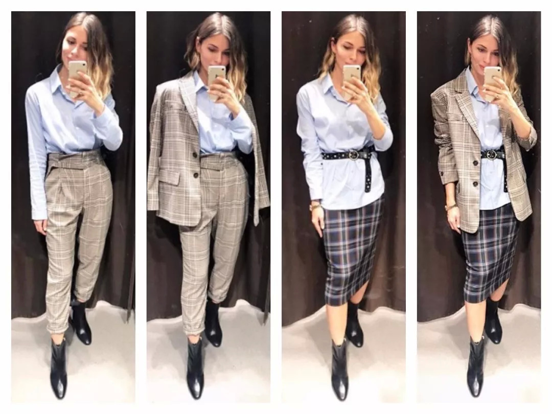 选一件基础蓝衬衫+一双黑靴子,以格纹元素作为造型主题来搭配。通过套装、半裙、腰带等,打造偏轻熟女的职场look。