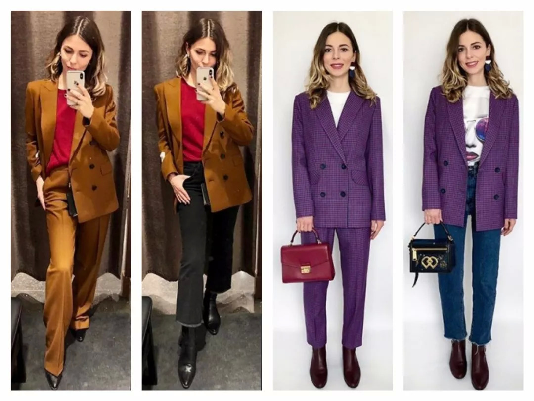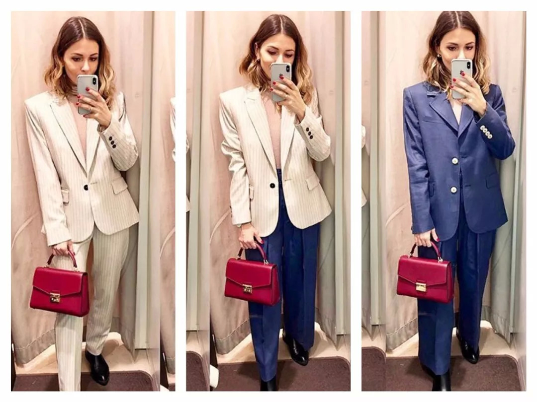 或者,同样是西装+鞋+西装裤的套路,把配套款换成同色系的,不就又多了两身look吗?注意:她选的是昨天刚写过的小白鞋哦~