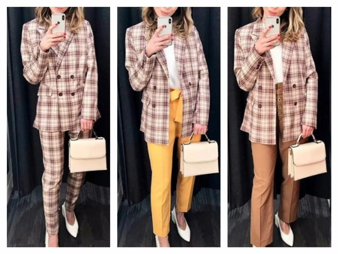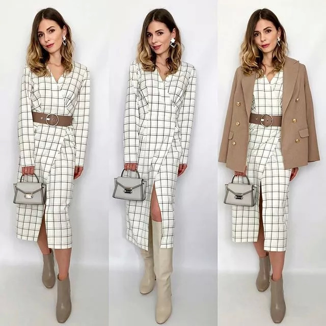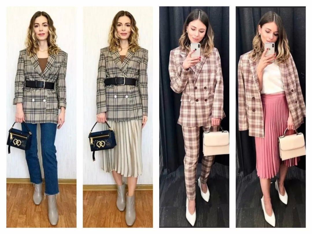 比如,一条棕色格纹裙+短靴是基础look。在此之上,加一根同色系腰带,时髦度多1分。而最终的完成look,披一件同色系西装即可。