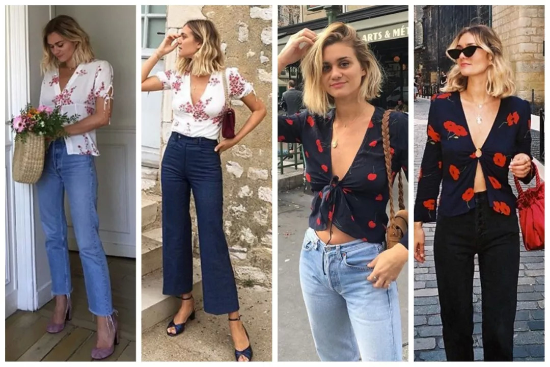 这两年一直很流行这种短短的法式小上衣。V领设计,超显瘦!像Anne这样搭配不同颜色的牛仔喇叭裤、一条硬币项链就很好看~