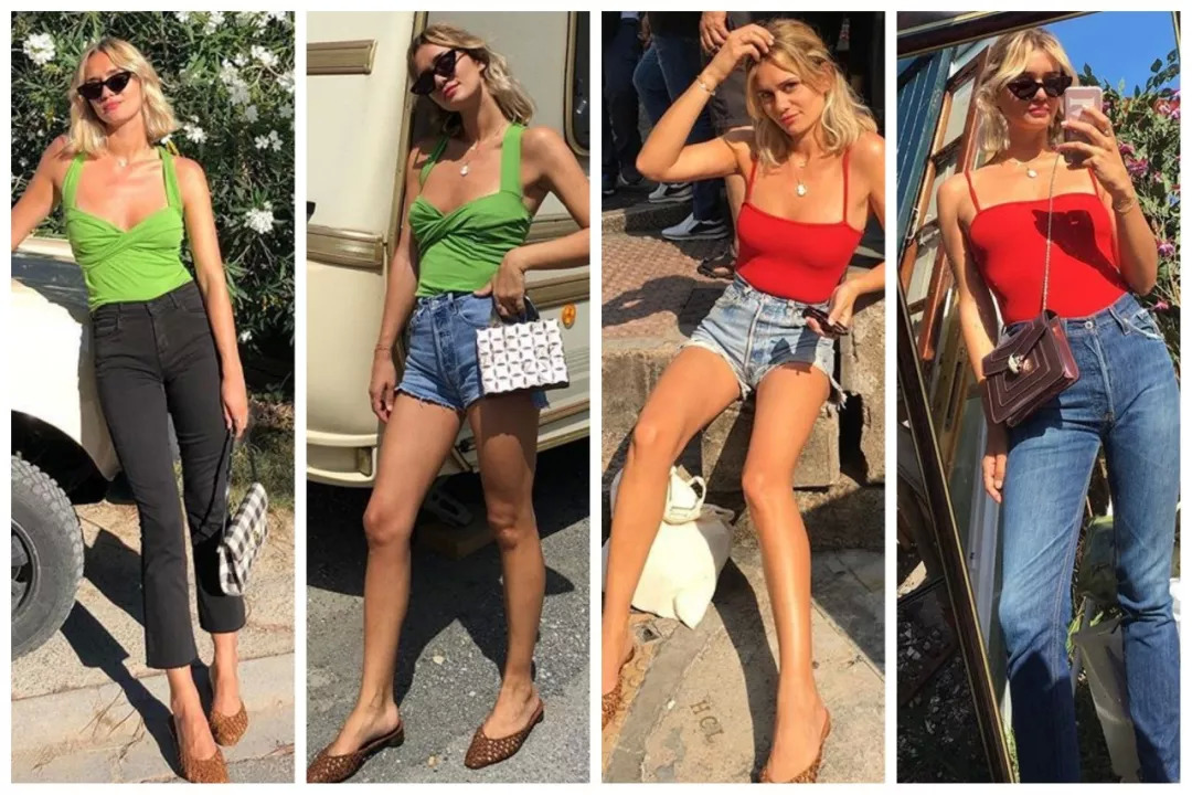 除了基础白色,Anne还爱穿鲜艳的绿色、红色吊带。从性感的鸡心领,到优雅方领,不用思考,统统牛仔裤搞定!