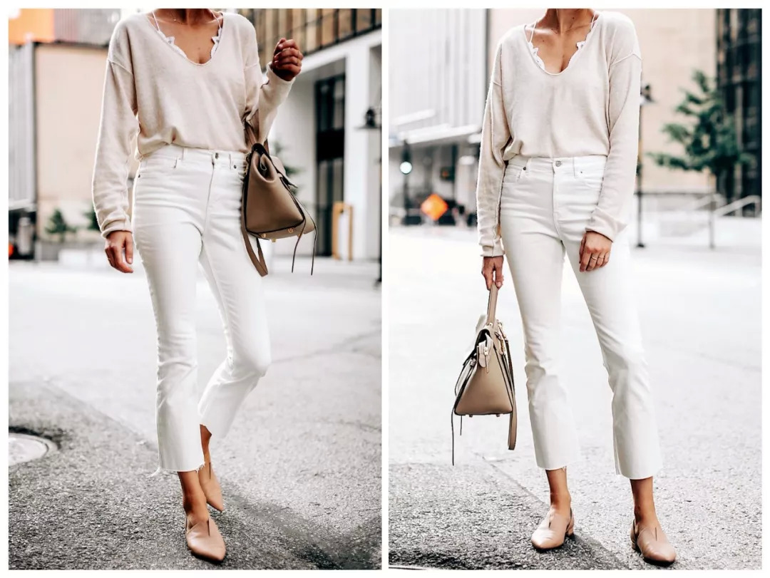 而且,它是8分+高腰裤型,避开了一般白裤子容易显腿短的问题。微喇须边细节,还把脚踝显得更细。