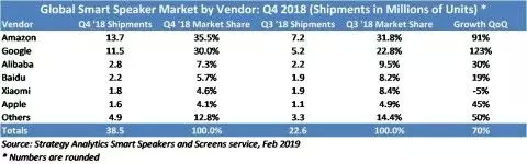 据市场研究公司Strategy Analytics数据显示,2018年第四季度的智能音箱销量依然火爆,总量达到3850万台,较2018年第三季度的2260万增长95%,超过2017年的全年总量。合并计算,2018年全年销量达到8620万台。