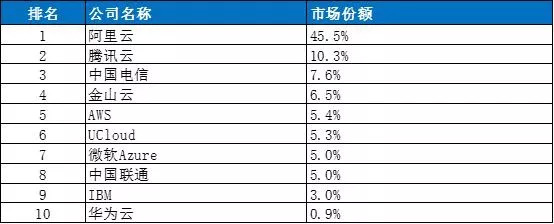 据IDC报告显示,2018年阿里云市场份额占比45.5%,排名第一;腾讯云市场份额10.3%,排名第二;中国电信第三,份额7.6%。