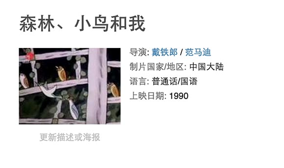 但《黑猫警长》并不是戴铁郎的最后一部动画片,1990年的时候他还跟范马迪一起导演了《森林、小鸟和我》。